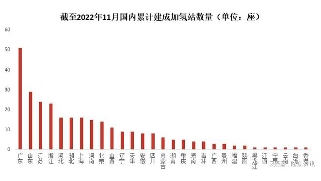 从建站年份来看,2021年国内建成加氢站122座,为历年来建站数量最多的年份,主要原因是受到去年的中石化发布“百站计划”、示范城市群政策即将落地、北京冬奥会氢能应用等利好因素影响,建站速度提升效果明显。2022年开年至11月,国内建成加氢站数量为40座,受公共安全事件影响,建站速度较去年明显放缓,预计2022年建站总数超越2021年的可能性不大。