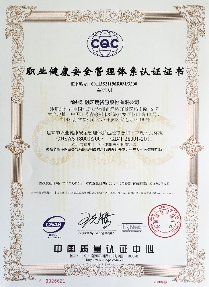 职业健康安全管理体系认证证书