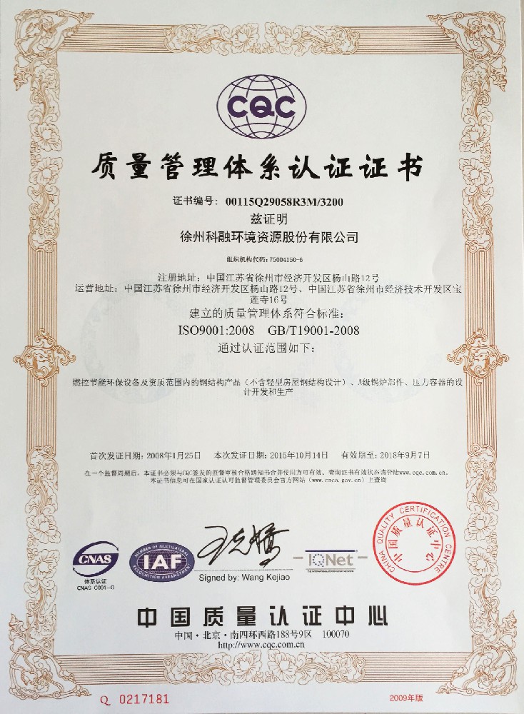 质量管理体系认证证书