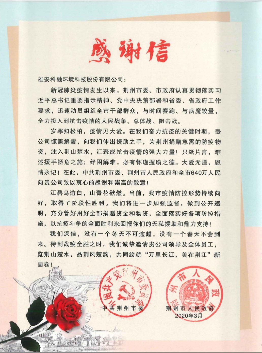 同舟共济,共抗疫情,科融环境向荆州市捐赠善款20万元及大批防疫物资