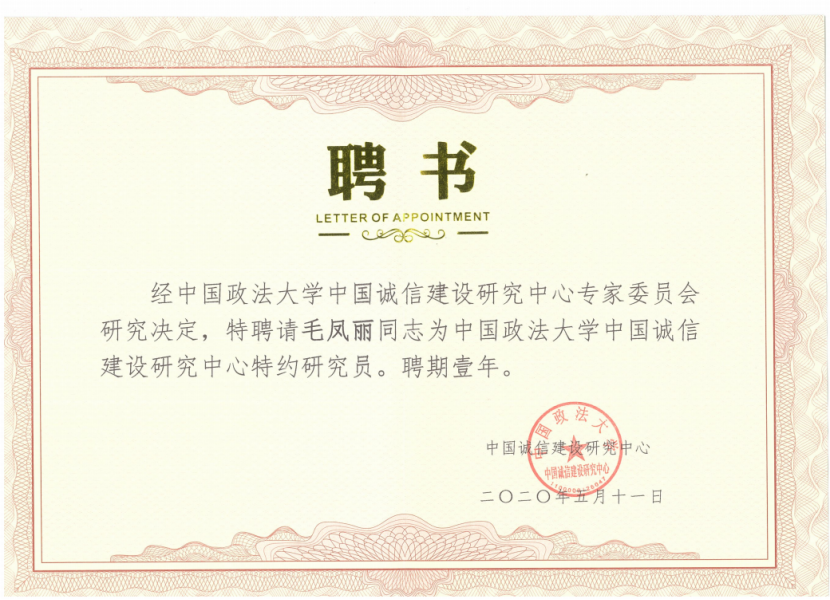 科融环境实控人毛凤丽受聘为中国诚信建设研究中心特约研究员