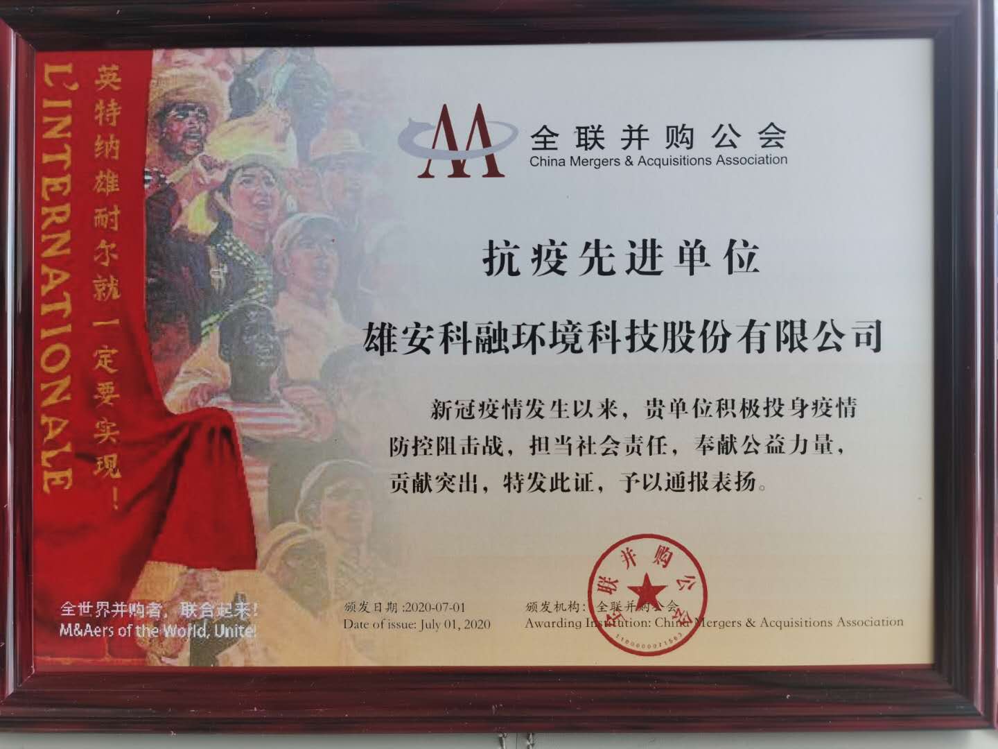 向抗疫先进致敬!科融环境荣获“全联并购公会抗疫先进单位”称号