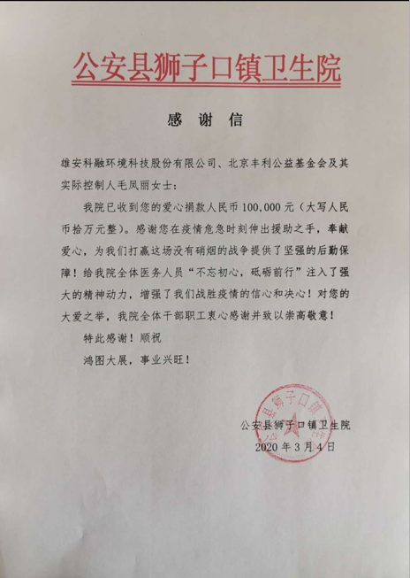 公安县狮子口镇卫生院致我司的感谢信